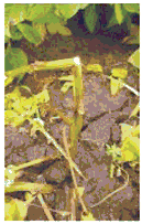 Pectobacterium spp. может вызывать увядание и скручивание листьев внутрь в верхней части. У основания стебля по мере развития заболевания обычно появляется черная слизистая гниль. Пораженные стебли легко отрываются (рисунок Д.4.2).