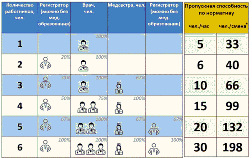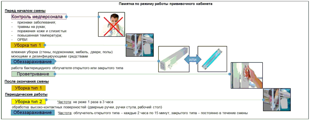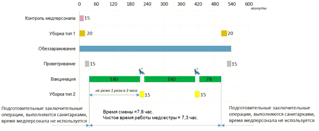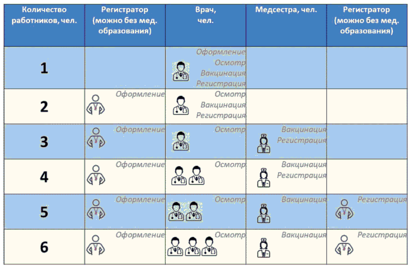 Отработано скоординированное действие терапевта и прививочной медицинской сестры, позволяющее сократить время между приемом пациентов в среднем до 3 минут. Врач проводит опрос и осмотр пациента, принимает решение о вакцинации и направляет пациента к мед. сестре, а сам в это время оформляет медицинскую документацию. После проведения вакцинации, приглашается следующий пациент на осмотр к врачу, а у медицинской сестры есть время на обработку рук, поверхности стола и внесения данных в учетные формы.