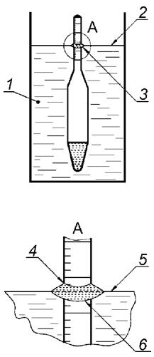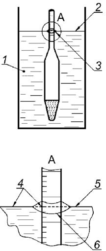 1 - жидкость; 2 - горизонтальная плоская поверхность жидкости; 3 - нижняя часть мениска; 4 - точка считывания шкалы; 5 - горизонтальная плоская поверхность жидкости; 6 - мениск