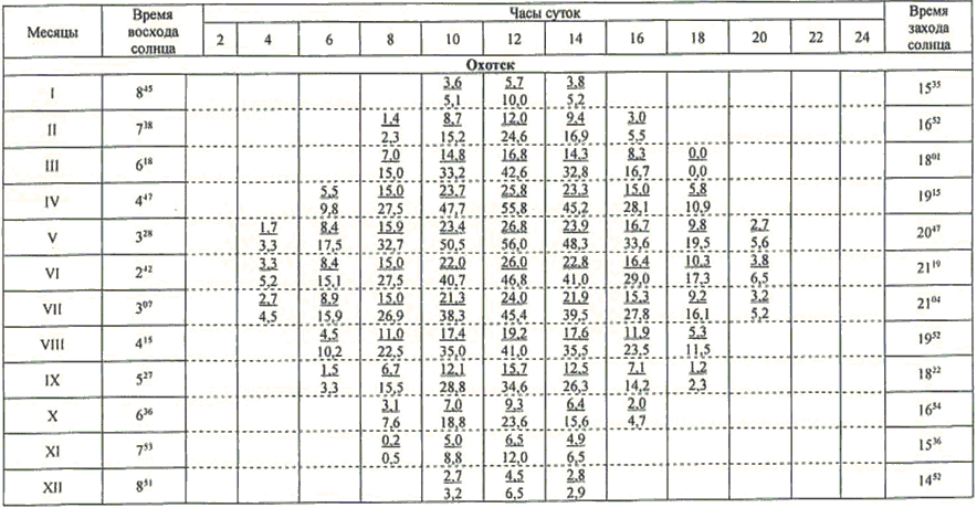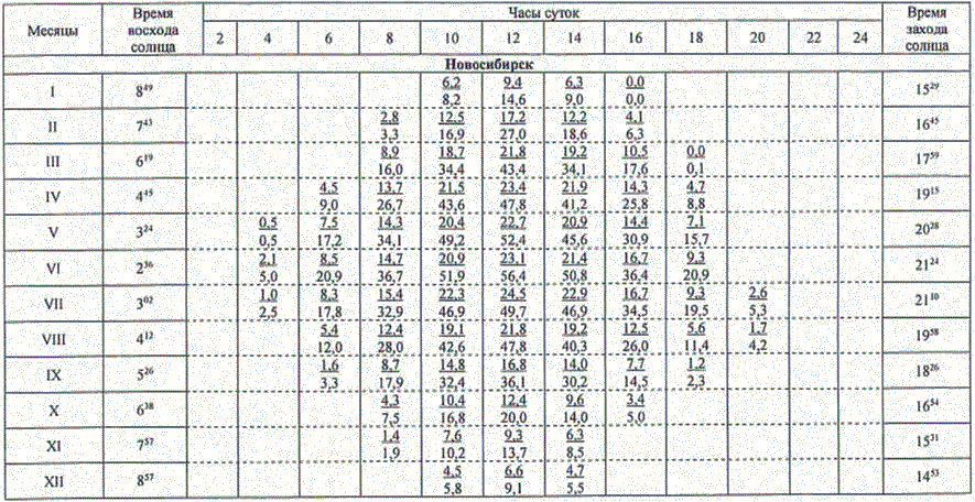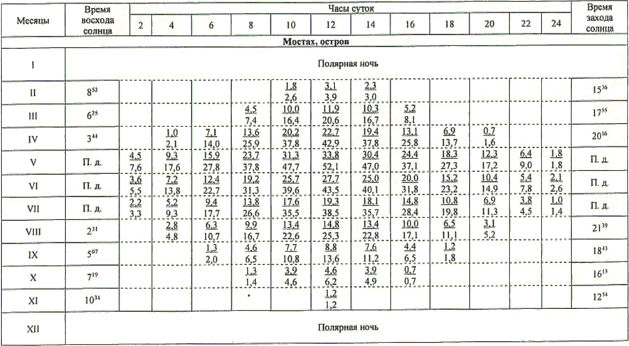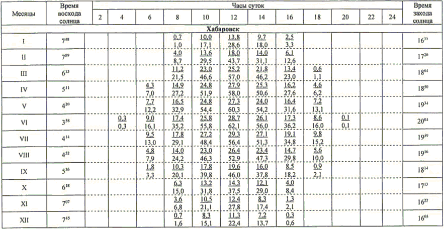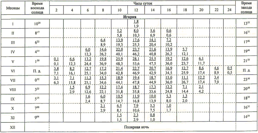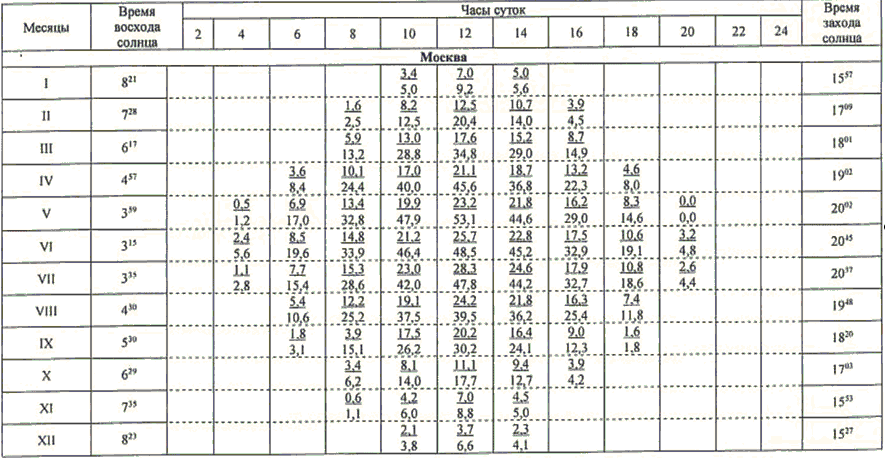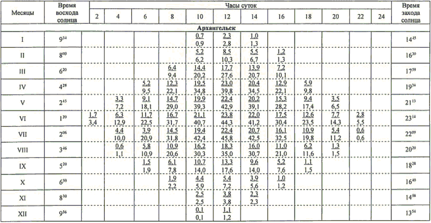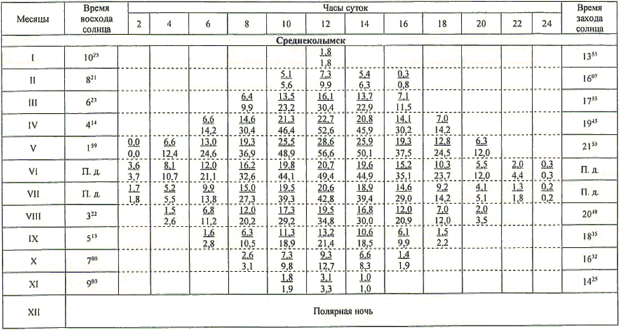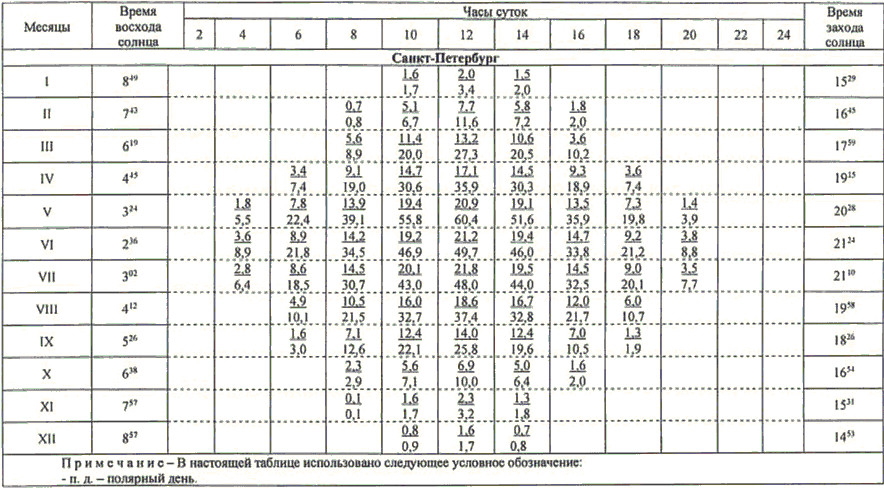 13.1 Значения высоты солнца над горизонтом (градусы) приведены в таблице 13.1.