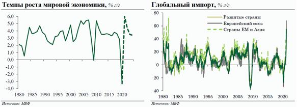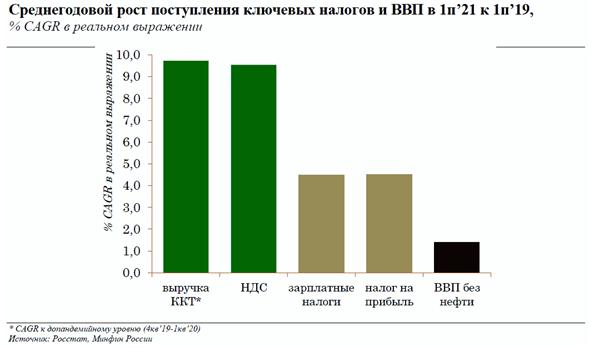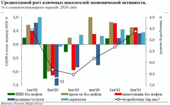 Восстановление отечественной экономики происходило более динамично по сравнению с другими странами, благодаря чему России одной из первых удалось выйти на допандемийные уровни выпуска. Объем ВВП без учета вклада нефтяного сектора в 1п'21 превысил уровень 1п'19 почти на +3,0%, то есть среднегодовой темп роста составил +1,4% в год, в то время как в большинстве стран Группы 20 ВВП даже не достиг допандемийного уровня (-3,1% CAGR 1п'21/1п'19 в Великобритании, -2,7% - в Италии, -2,0% - в Германии, -1,9% - во Франции, +0,8% - в США).