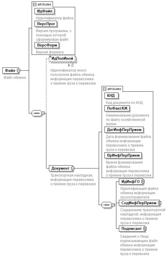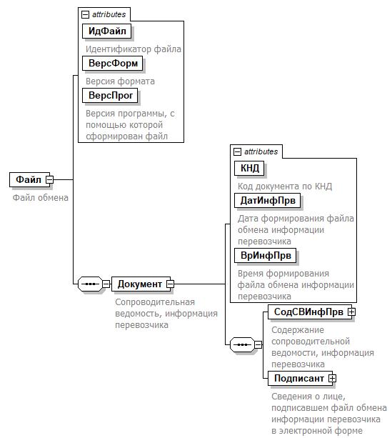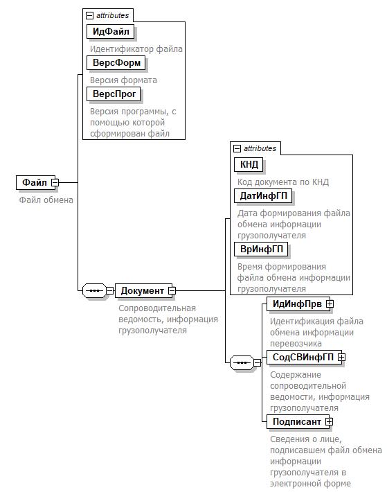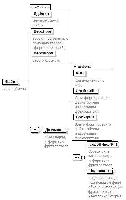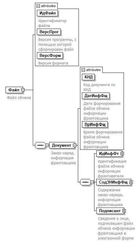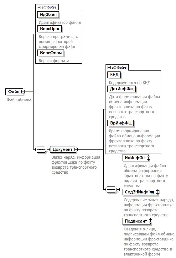| Идентификатор файла обмена информация фрахтовщика | ИдФайлИнфФщ | A | T(1-255) | О | Содержит (повторяет) имя файла обмена информация фрахтовщика без расширения |