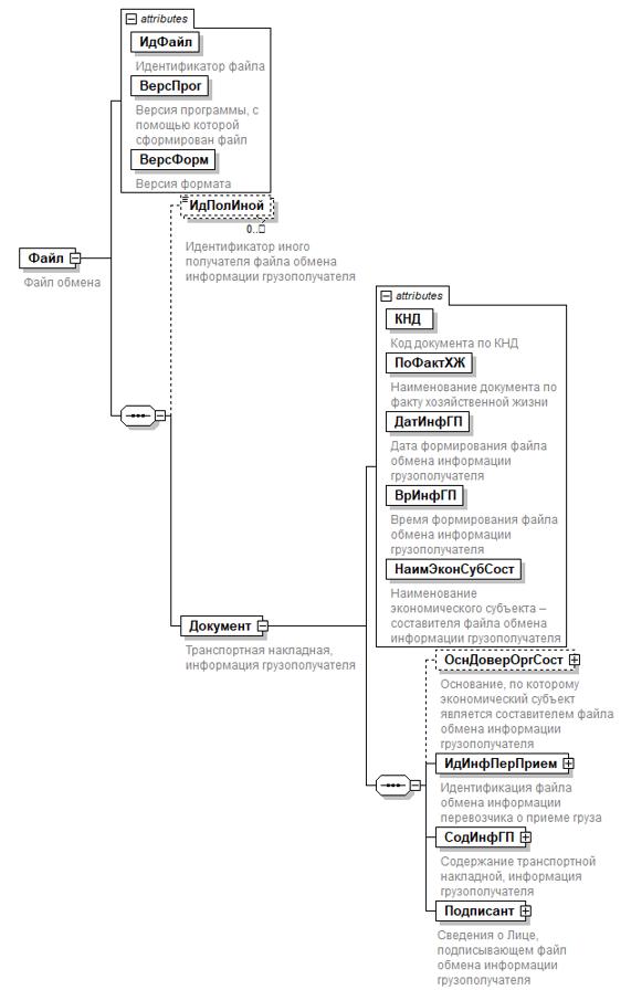 файл обмена информации грузополучателя, состоящей из сведений грузополучателя о приеме груза от перевозчика, а также о фактических характеристиках принятого груза и обстоятельствах приемки. Файл обмена подписывается усиленной квалифицированной электронной подписью грузополучателя или усиленной квалифицированной электронной подписью уполномоченного на подписание транспортной накладной от имени грузополучателя;