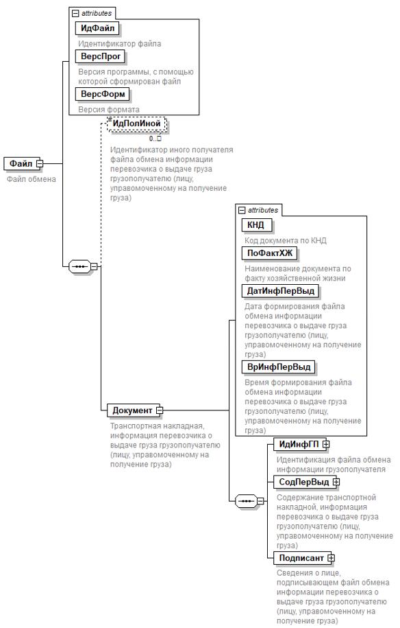 файл обмена информации перевозчика о выдаче груза грузополучателю (лицу, управомоченному на получение груза), состоящей из дополнительных к информации грузополучателя сведений перевозчика в отношении выдачи вверенного ему грузоотправителем груза и фактических обстоятельств такой выдачи. Файл обмена подписывается усиленной квалифицированной электронной подписью перевозчика.