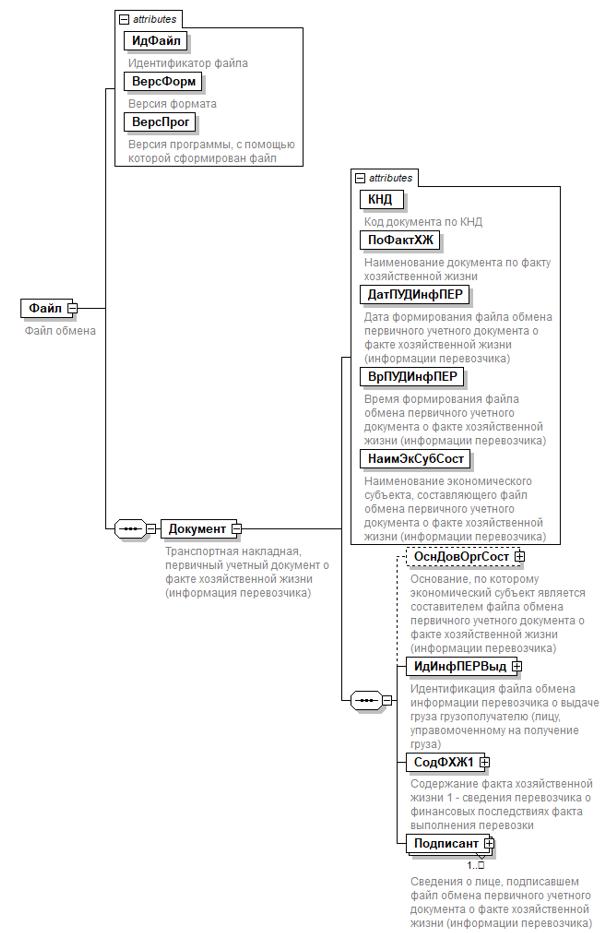 файл обмена информации перевозчика об изменении финансового состояния перевозчика и грузоотправителя в результате выполнения перевозки (далее - первичный учетный документ о факте хозяйственной жизни (информация перевозчика)), состоящей из сведений о выполнении перевозки, о стоимости перевозки груза (установленной плате), порядке расчета платы за перевозку груза. Файл обмена подписывается электронной подписью лица, ответственного за оформление факта хозяйственной жизни со стороны перевозчика (уполномоченного лица);
