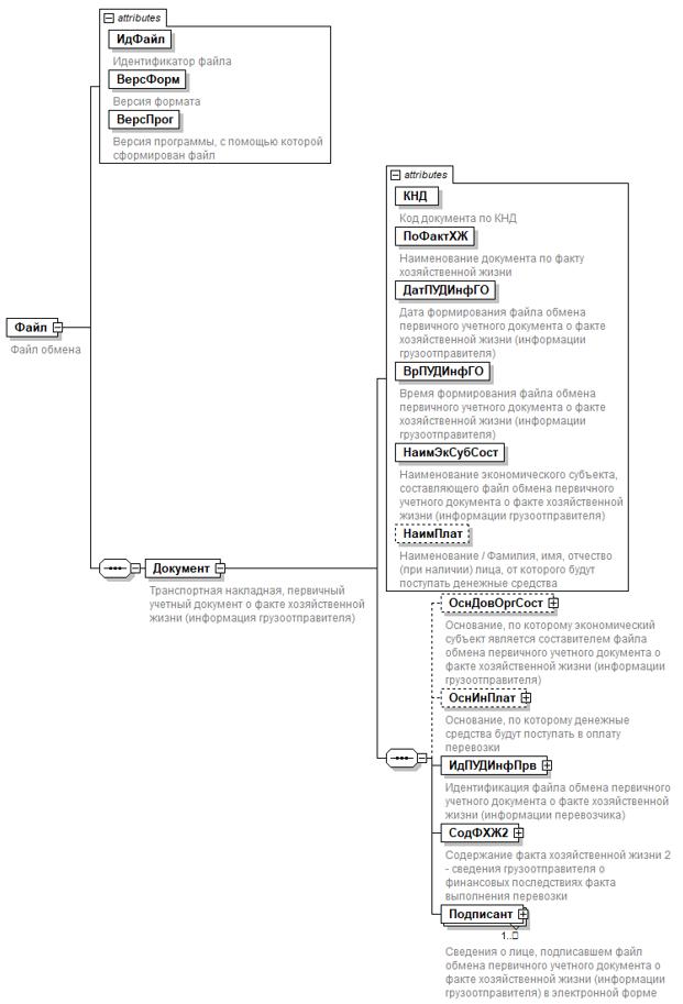 | Наименование документа по факту хозяйственной жизни | ПоФактХЖ | A | T(1-255) | О | Принимает значение: "Транспортная накладная, информация грузоотправителя" |