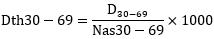| где: Dth30 - 69 - смертность прикрепленного населения в возрасте от 30 до 69; D30 - 69 - число умерших в возрасте от 30 до 69 лет из числа прикрепленного населения за период; Nas30 - 69 - численность прикрепленного населения в возрасте от 30 до 69 лет за период. | ||||