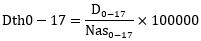 | где: Dth0 - 17 - смертность детей в возрасте 0 - 17 лет за период в медицинских организациях, имеющих прикрепленное население; D0 - 17 - число умерших детей в возрасте 0 - 17 лет включительно среди прикрепленного населения за период; Nas0 - 17 - численность прикрепленного населения детей в возрасте 0 - 17 лет включительно за период. | ||||