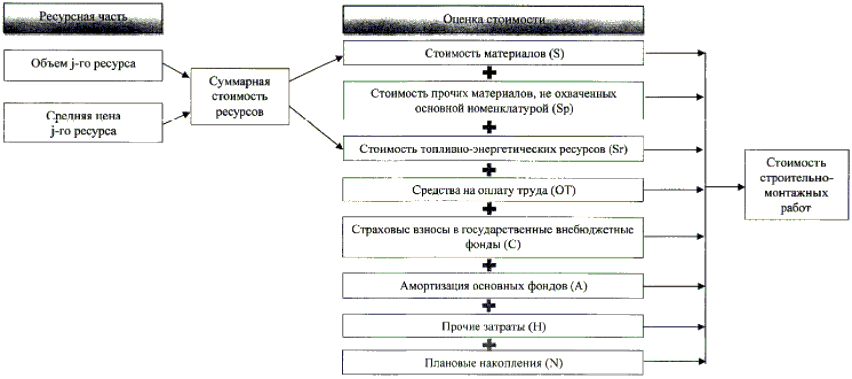 Общая стоимость строительно-монтажных работ определяется как сумма стоимостей используемых материальных и трудовых ресурсов, а также других затрат, включаемых в ресурсно-технологическую модель.