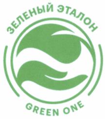 Над окружностью под наклоном располагается словесный элемент "ЗЕЛЕНЫЙ ЭТАЛОН" (на русском языке), выполненный заглавными кириллическими буквами зеленого цвета. Под окружностью под наклоном располагается словесный элемент "GREEN ONE", выполненный заглавными латинскими буквами зеленого цвета.