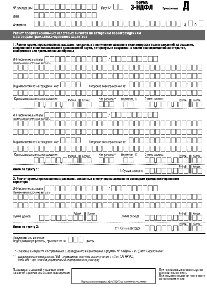 3.7. Приложение Д "Расчет профессиональных налоговых вычетов по авторским вознаграждениям и договорам гражданско - правового характера"