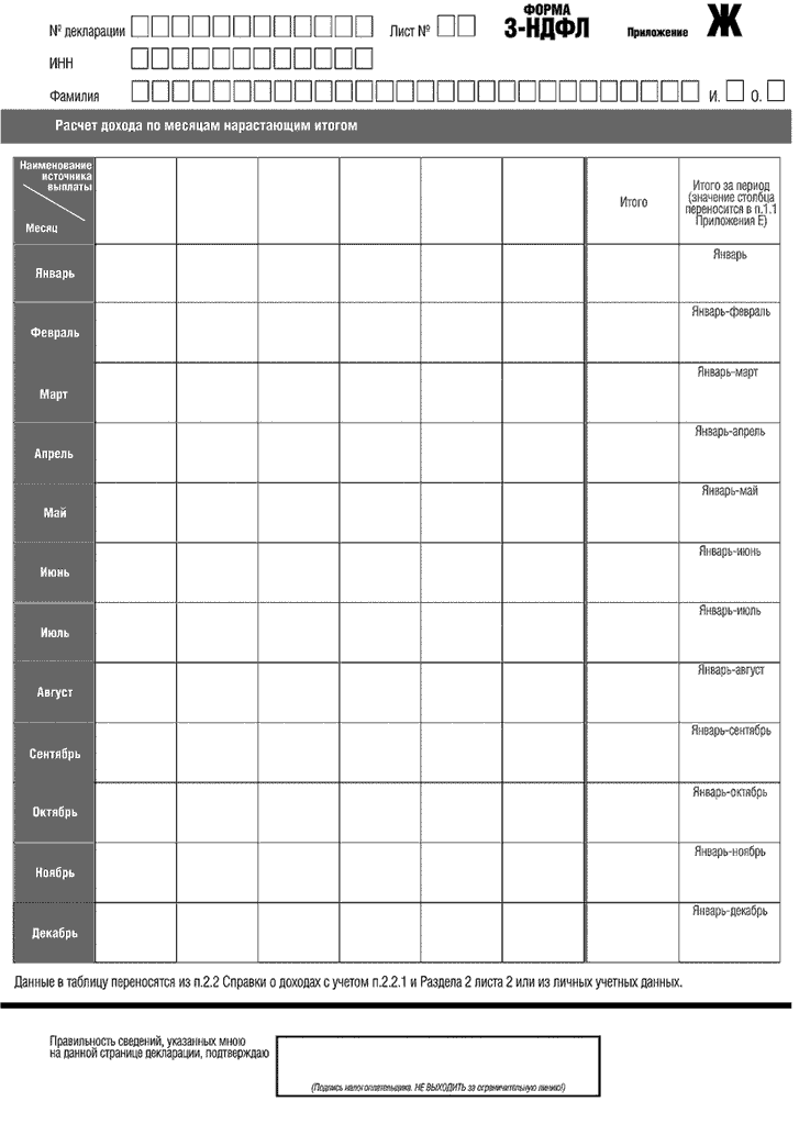 В данном Приложении рассчитываются нарастающим итогом доходы, облагаемые налогом по ставке 13%, по месяцам, в которых они получены. Показатели по каждому источнику выплаты заносятся в отдельную графу таблицы из пункта 2.2 Справки о доходах или из учетных данных физического лица. По графе "Итого" суммируются все значения доходов по каждому месяцу.