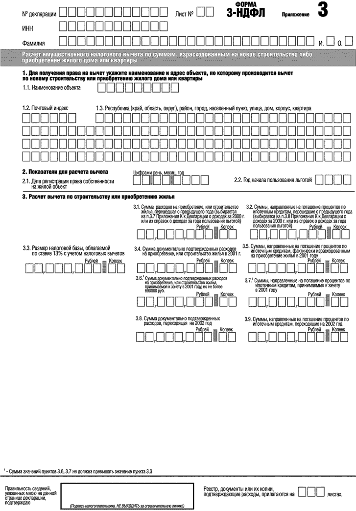 Это приложение заполняется теми физическими лицами, которые имеют право на имущественный налоговый вычет в сумме, израсходованной на новое строительство либо приобретение на территории Российской Федерации жилого дома или квартиры, в размере фактически произведенных расходов, но не более 600000 руб., а также в сумме, направленной на погашение процентов по ипотечным кредитам, полученным налогоплательщиком в банках Российской Федерации и фактически израсходованным им на новое строительство либо приобретение на территории Российской Федерации жилого дома или квартиры.