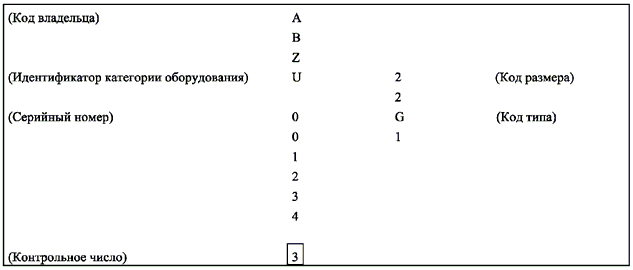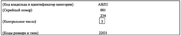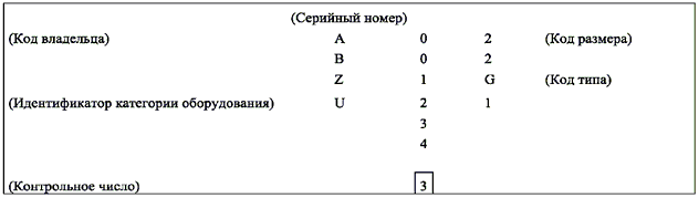 Код владельца, идентификатор категории оборудования, серийный номер и контрольное число на контейнерах желательно размещать на одной горизонтальной линии (см. рисунок 1). В случае особой конструкции контейнера допускается размещать их вертикально (см. рисунок 2).
