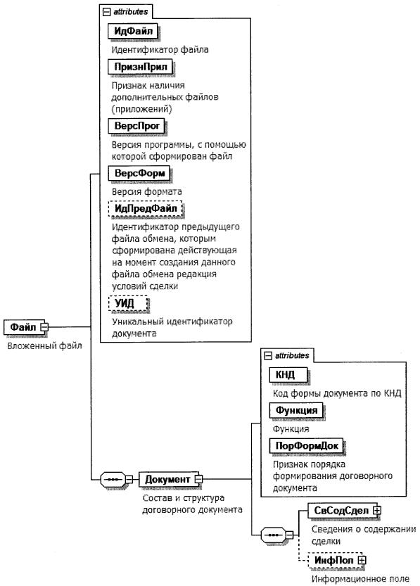 К вышеперечисленным признакам обязательности элемента может добавляться значение "У" в случае описания в XML схеме условий, предъявляемых к элементу во вложенном файле, описанных в графе "Дополнительная информация";