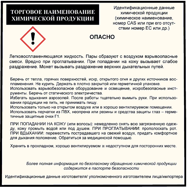 - указание на то, что более полная информация по безопасному обращению химической продукции содержится в паспорте безопасности (для химической продукции, предназначенной для использования в быту).