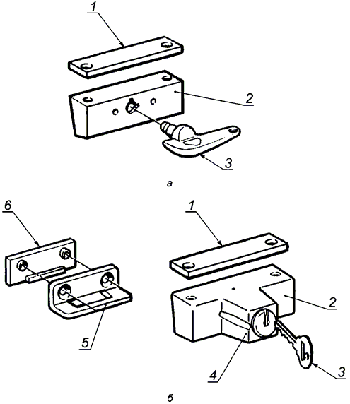 Рисунок Г.4 - Детские замки безопасности для конструкций из ПВХ-профилей без замочного цилиндра (а) и с замочным цилиндром (б)