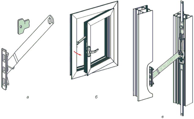 а - механическое фиксирующее устройство; б - распашной оконный блок с механическим фиксирующим устройством; в - схема установки механического фиксирующего устройства в оконном блоке