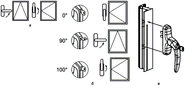 а - положение ручки при откидном и распашном открывании створки; б - положение ключа и ручки при закрытой створке (0°), при откидном открывании створки (90°), при распашном открывании створки (180°); в - оконная ручка с цилиндровым механизмом