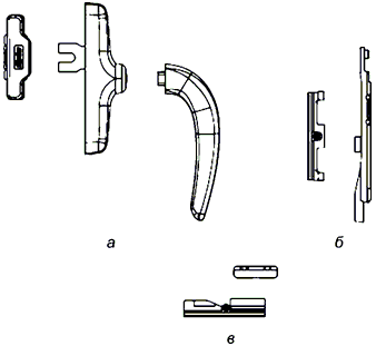 а - съемная ручка с защелкивающимся механизмом; б - механизм защелкивания с ответной планкой; в - место захода защелкивающегося механизма