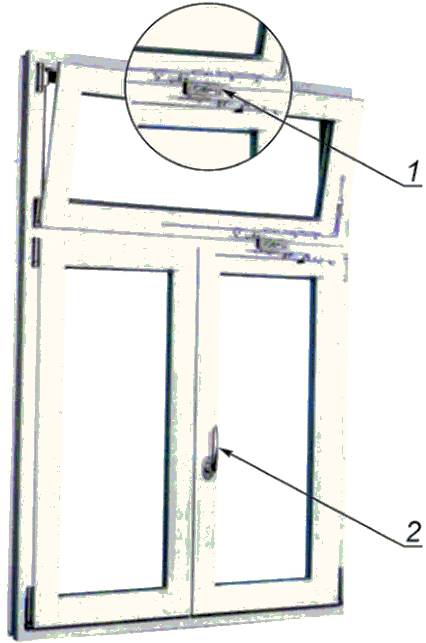 1 - фрамужный механизм открывания; 2 - центральная ручка