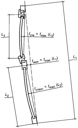 Б.2.3.4 Фактический относительный прогиб силовых профильных элементов, светопрозрачного заполнения, а также профильных элементов створок оконных и балконных конструкций не должен превышать соответствующих им предельных значений Б.2.1 (см. рисунок Б.1).