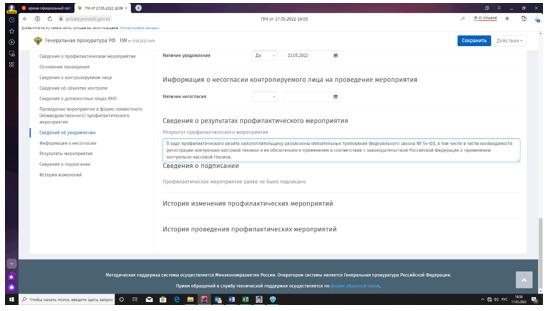 Для перехода в статус "Завершено" необходимо заполнить Результат профилактического мероприятия в блоке "Сведения о результатах профилактического мероприятия".