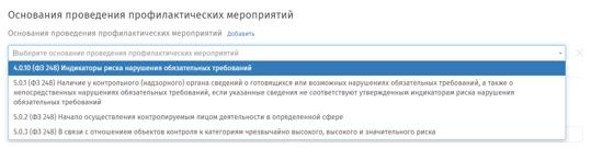 - Основания проведения профилактических мероприятий (Выбор из выпадающего списка);