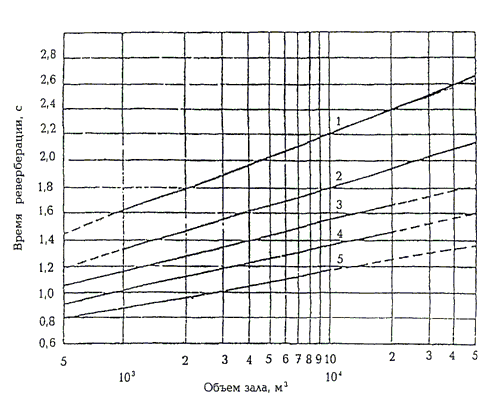 Рисунок 4. Рекомендуемое время реверберации на средних частотах (500 - 1000 Гц) для залов различного назначения в зависимости от их объема