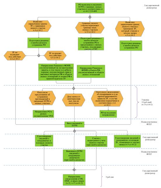 | Дополнительно отмечаем, что в соответствии с частью 14 статьи 60.2 Закона N 218-ФЗ в течение пятнадцати рабочих дней со дня получения решения о необходимости исправления реестровой ошибки в отношении пересекающихся лесных участков орган исполнительной власти субъекта Российской Федерации, уполномоченный в области лесных отношений, представляет предложения об устранении противоречий в содержащихся в ЕГРН сведениях о лесных участках. При непоступлении в указанный срок предложений органа исполнительной власти субъекта Российской Федерации, уполномоченного в области лесных отношений, предложения органа регистрации прав считаются согласованными и являются основанием для осуществления исправления реестровой ошибки в соответствии с частями 15 и 16 статьи 60.2 Закона о регистрации. | |||||||