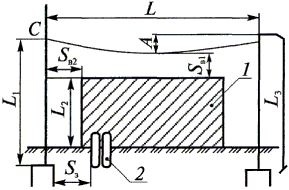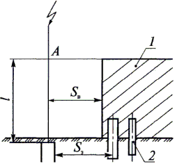 - наименьшие допустимые расстояния от тросового молниеотвода соответственно в точках A и C до защищаемого сооружения; Sз - наименьшее допустимое расстояние от заземления до металлических коммуникаций; 1 - защищаемое сооружение; 2 - металлические коммуникации.