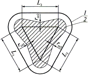 L1, L2, L3 - расстояния между молниеотводами; 1, 2 - границы зон защиты на уровнях соответственно земли и высоты защищаемого сооружения