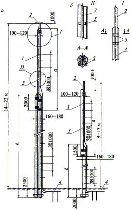 Рисунок 13. Устройство стержневых молниеотводов на деревянных опорах: а - двух; б - одной