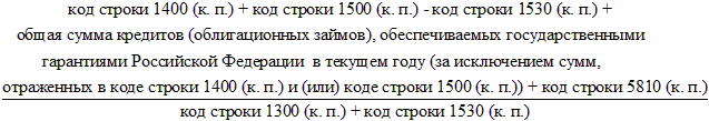 | К6 | отношение суммы заемных средств (с учетом суммы кредитов (облигационных займов), привлекаемых принципалом под государственные гарантии Российской Федерации) и выданного принципалом обеспечения обязательств и платежей к собственным средствам | определяет кредитоспособность принципала и его финансовую устойчивость | отношение суммы величин заемных средств, кредитов (облигационных займов), обеспечиваемых государственными гарантиями Российской Федерации в текущем году, и обеспечения обязательств и платежей, выданного принципалом, к собственным средствам (расчет по данным бухгалтерского баланса и пояснений к бухгалтерскому балансу и отчету о финансовых результатах): а) при предоставлении государственной гарантии Российской Федерации: |