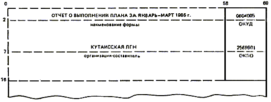 Пример. Координаты ячеек 1.0-5.57 определяют поле данных реквизита "Наименование формы", координаты ячеек 1.58-3.68 - поле данных реквизита "Код формы" по ОКУД, в соответствии с черт.2.