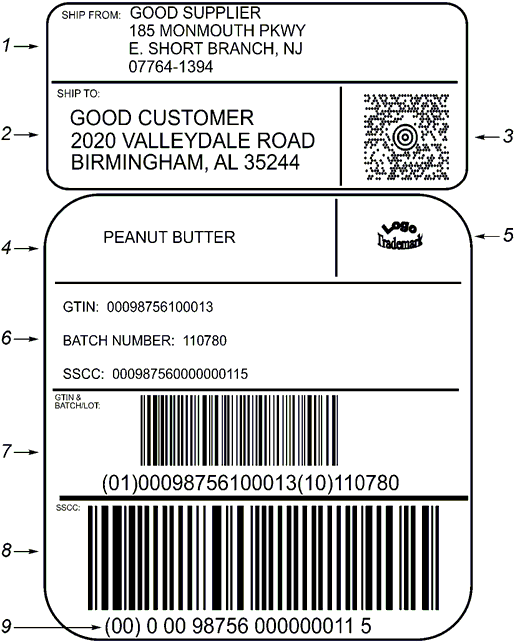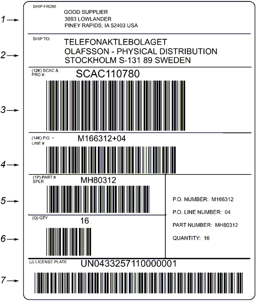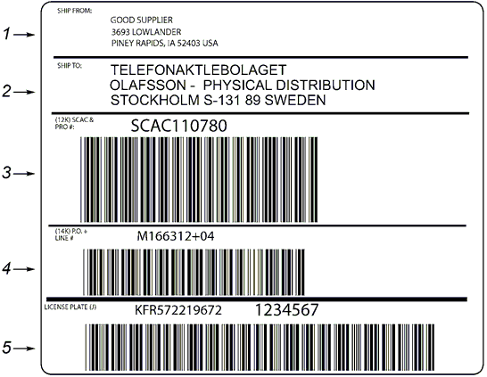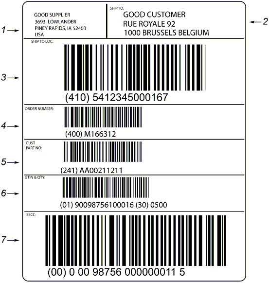 Транспортная этикетка, маркированная символами штрихового кода, разрабатывается для обеспечения автоматизации управленческих операций отгрузки и приемки. Информация, закодированная в штриховом коде на транспортной этикетке, может служить ключом для доступа к соответствующей базе данных, содержащей детальную информацию о транспортируемой единице, включая информацию, передаваемую путем электронного обмена данными. По согласованию между торговыми партнерами транспортная этикетка может также содержать и иную информацию.
