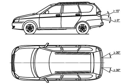 ж) только относительно наружных выступов (раздел 17 настоящего стандарта): окон, ручек, петель, кнопок и крышек наливных горловин топливных баков.