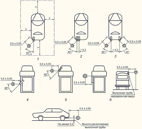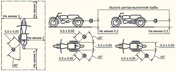 В.10 Схемы установки микрофона для измерения уровня шума выпуска отработавших газов ТС категорий L при различном расположении выпускных труб приведены на рисунке В.2.