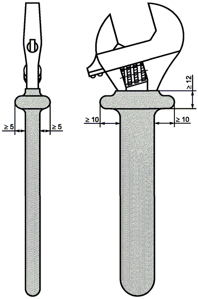 Изолирующие инструменты, специально предназначенные для работы под напряжением, могут иметь более низкую устойчивость к напряжению, чем изолированный инструмент, если они выдерживают ожидаемые рабочие нагрузки без сбоев из-за постоянной деформации или разрушения.