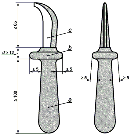 Дизайн и конструкция рукояток должны обеспечивать надежную фиксацию инструмента в руке и не допускать непреднамеренного соскальзывания. Размеры рукояток и защитных упоров приведены на различных рисунках и применимы ко всем типам инструментов для определения рабочей зоны.