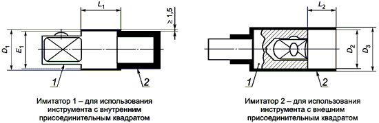 Надежность удерживавших систем сборных инструментов с взаимозаменяемыми компонентами, изготовленными разными производителями (см. 4.4.1.3.2), должна быть проверена с помощью соответствующего имитатора. Допускается изменять форму имитатора, если это обусловлено измерительным прибором, используемым для испытания, но размеры присоединительного квадрата должны соответствовать значениям, указанным на рисунках 25 и 26. Для обеспечения выполнения назначенной функции со всеми возможными комбинациями допусков в соответствии с ISO 1174-1 всегда используют минимальный и максимальный имитатор.