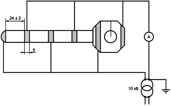 В начале испытания кончик испытательного пламени должен касаться изоляционного материала в нижней части рабочей головки, обращенной к испытуемому инструменту (см. рисунок 27).
