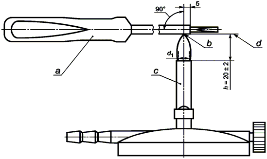 Затем горелку помещают в испытательное положение, как показано на рисунке 27, таким образом, чтобы ось пламени была перпендикулярна оси инструмента.
