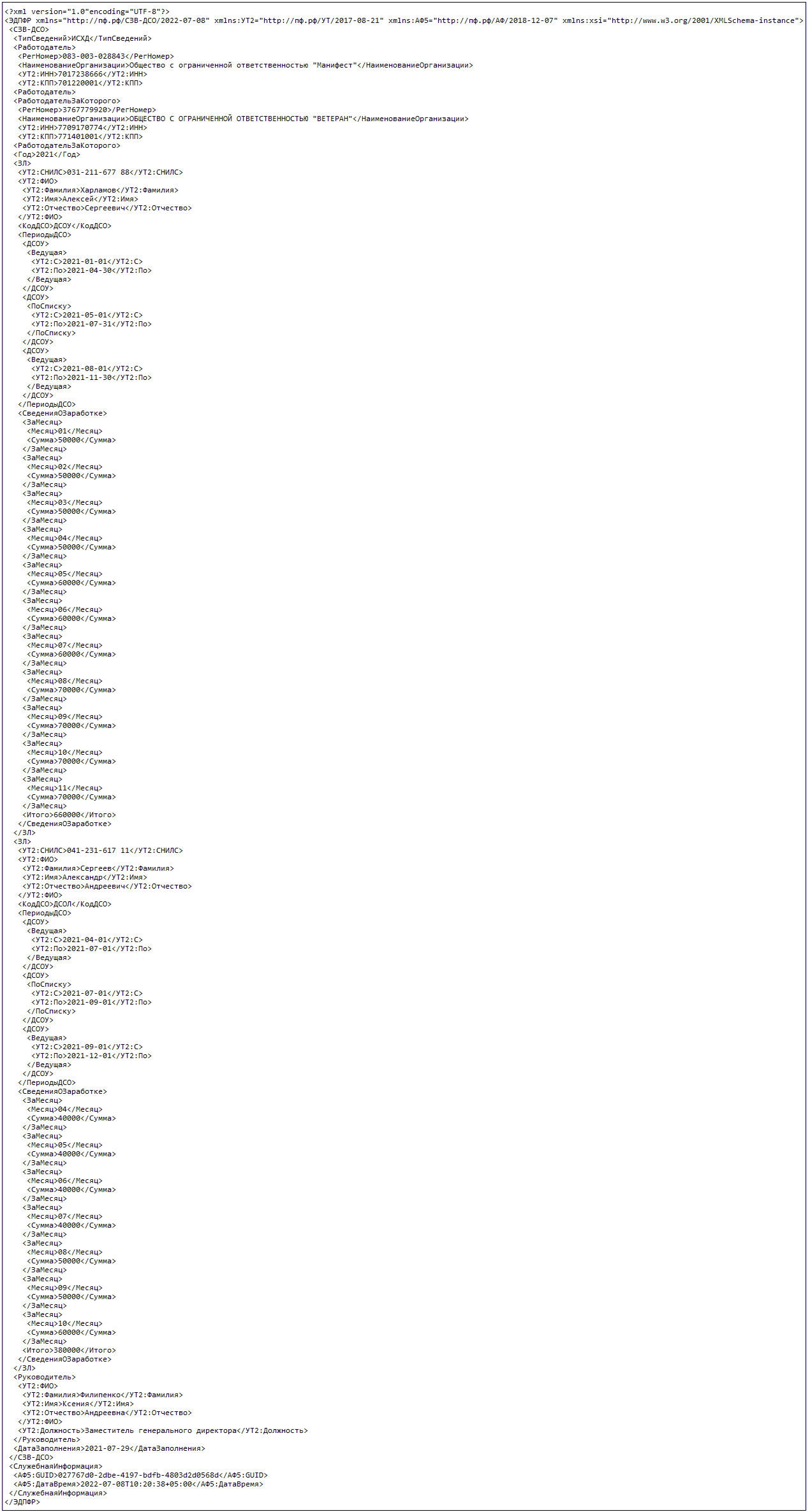 Сведения о периодах работы, дающей право на ежемесячную доплату к пенсии, и сумме заработка, из которого исчисляется размер ежемесячной доплаты к пенсии застрахованного лица. Пример 2