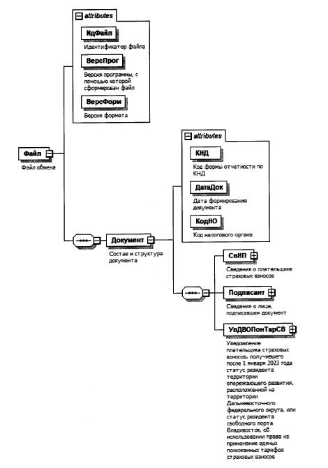 ФОРМАТ ПРЕДСТАВЛЕНИЯ УВЕДОМЛЕНИЯ ПЛАТЕЛЬЩИКА СТРАХОВЫХ ВЗНОСОВ, ПОЛУЧИВШЕГО ПОСЛЕ 1 ЯНВАРЯ 2023 ГОДА СТАТУС РЕЗИДЕНТА ТЕРРИТОРИИ ОПЕРЕЖАЮЩЕГО РАЗВИТИЯ, РАСПОЛОЖЕННОЙ НА ТЕРРИТОРИИ ДАЛЬНЕВОСТОЧНОГО ФЕДЕРАЛЬНОГО ОКРУГА, ИЛИ СТАТУС РЕЗИДЕНТА СВОБОДНОГО ПОРТА ВЛАДИВОСТОК, ОБ ИСПОЛЬЗОВАНИИ ПРАВА НА ПРИМЕНЕНИЕ ЕДИНЫХ ПОНИЖЕННЫХ ТАРИФОВ СТРАХОВЫХ ВЗНОСОВ В ЭЛЕКТРОННОЙ ФОРМЕ