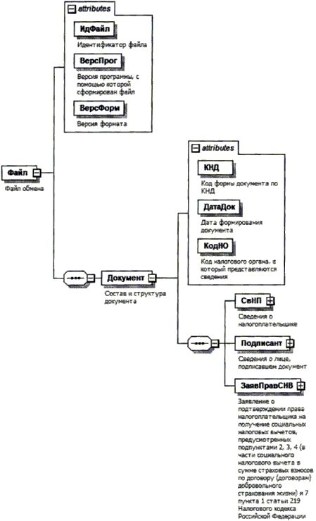 | Заявление о подтверждении права налогоплательщика на получение социальных налоговых вычетов, предусмотренных подпунктами 2, 3, 4 (в части социального налогового вычета в сумме страховых взносов по договору (договорам) добровольного страхования жизни) и 7 пункта 1 статьи 219 Налогового кодекса Российской Федерации | ЗаявПравСНВ | С | О | Состав элемента представлен в таблице 4.9 |