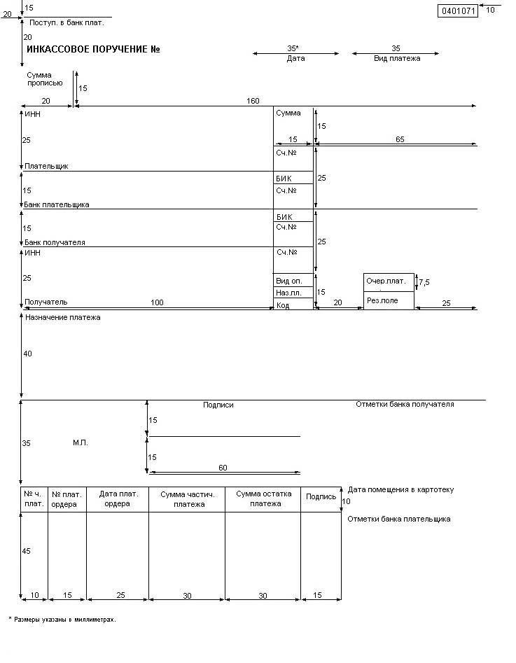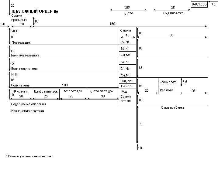 При заполнении расчетных документов не допускается выход текстовых и цифровых значений реквизитов за пределы полей, отведенных для их проставления. Значения реквизитов должны читаться без затруднения.