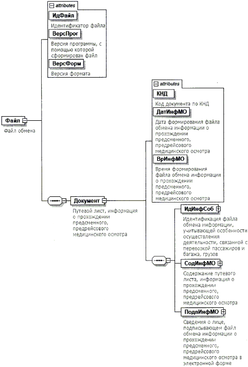 файл обмена информации о результате предсменного, предрейсового медицинского осмотра, состоящей из сведений о дате и времени проведения предсменного, предрейсового медицинского осмотра, о результате проведения предсменного, предрейсового медицинского осмотра, о водителе (водителях), о медицинском работнике, состоящем в штате юридического лица или индивидуального предпринимателя, осуществляющего деятельность по перевозке пассажиров и багажа, грузов, или о медицинской организации и медицинском работнике, состоящем в штате медицинской организации. Файл обмена подписывается усиленной квалифицированной электронной подписью или усиленной неквалифицированной электронной подписью, сертификат ключа проверки которой создан и используется в инфраструктуре, обеспечивающей информационно-технологическое взаимодействие информационных систем, используемых для предоставления государственных и муниципальных услуг в электронной форме и при условии организации взаимодействия физического лица с такой инфраструктурой с применением прошедших процедуру оценки соответствия средств защиты информации о результате предсменного, предрейсового медицинского осмотра, медицинского работника, проводившего предсменный, предрейсовый медицинский осмотр;