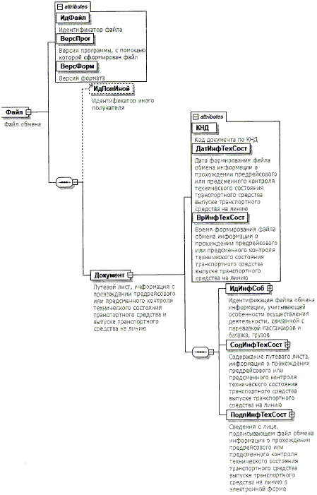 файл обмена информации о результате предрейсового или предсменного контроля технического состояния транспортного средства и выпуске транспортного средства на линию, состоящей из сведений о дате и времени проведения предрейсового или предсменного контроля технического состояния транспортного средства, о результате проведения предрейсового или предсменного контроля технического состояния транспортного средства, о дате и времени выпуска транспортного средства на линию, о должностном лице, ответственном за техническое состояние и безопасную эксплуатацию транспортного средства. Файл обмена подписывается усиленной квалифицированной электронной подписью или усиленной неквалифицированной электронной подписью, сертификат ключа проверки которой создан и используется в инфраструктуре, обеспечивающей информационно-технологическое взаимодействие информационных систем, используемых для предоставления государственных и муниципальных услуг в электронной форме и при условии организации взаимодействия физического лица с такой инфраструктурой с применением прошедших процедуру оценки соответствия средств защиты информации о результате предрейсового или предсменного контроля технического состояния транспортного средства и выпуске транспортного средства на линию, должностного лица, ответственного за техническое состояние и безопасную эксплуатацию транспортного средства, назначенного решением руководителя юридического лица или индивидуального предпринимателя;