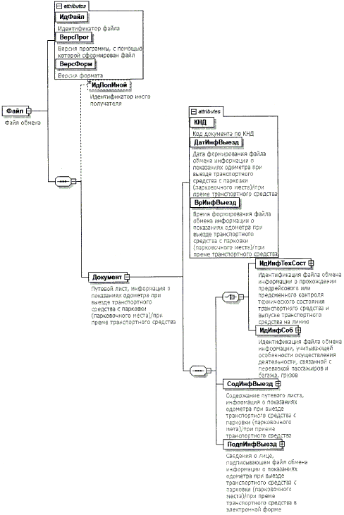 | Идентификация файла обмена информации о показаниях одометра при выезде транспортного средства с парковки (парковочного места)/при приеме транспортного средства от другого водителя | ИдИнфВыезд | С | | О | Состав элемента представлен в таблице 13.3 |